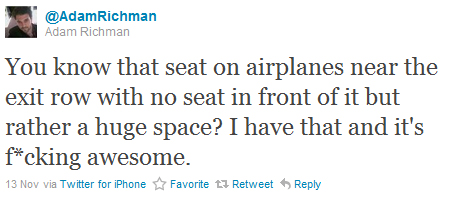 That is the BEST seat on a plane! If airlines actually cared about passengers, they'd make every row like that. But they don't. So we all fly crammed into the plane like a sardine - except for that one lucky bastard who gets that special seat.